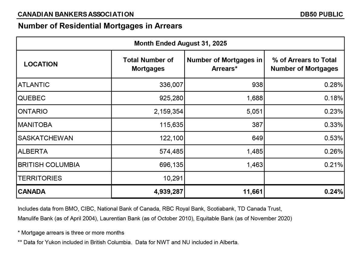 As of August 2025, the most recent statistics available, the national arrears rate was 0.24%, which means that less than a quarter of a percentage point of mortgages are in arrears. This is well below levels in the United States and the United Kingdom. While arrears rates in Canada have edged upward in recent months, they are still close to historic lows.